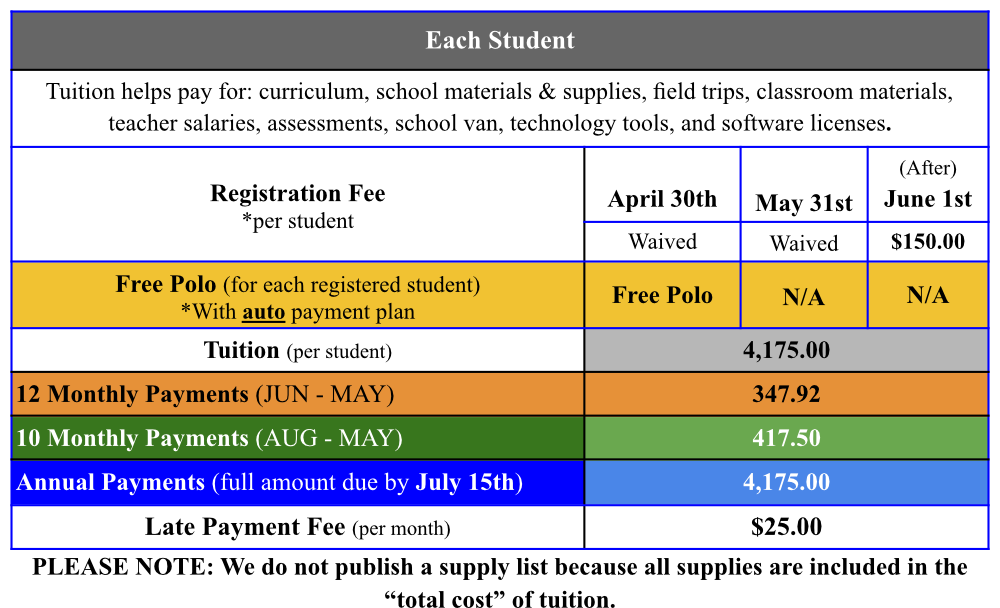 Auto Payments: Families who sign up for auto payments AND enroll by April 30th for the upcoming school year, will have their registration fee waived and receive a free polo shirt. By May 31st, the registration fee is waived. Auto payment plans can be made for full annual tuition, 12 months, (or) 10 months. Once registration is filled out, then links will be shared via email to pay the enrollment fee (if not waived) and to set up automatic payments.